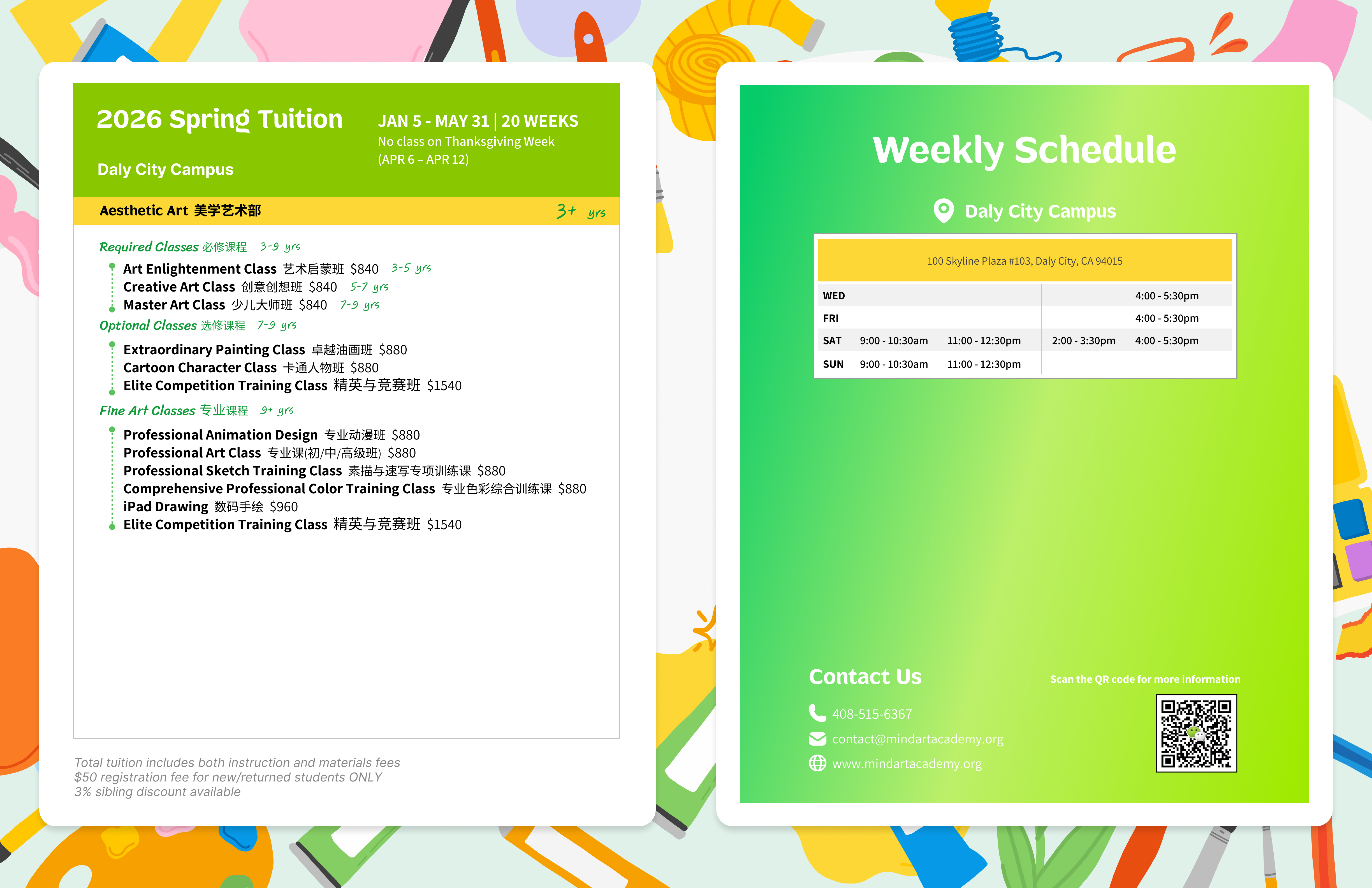 *If you pay with Zelle or Paypal, please remember to write student's first and last name, class level in the note. Save the screenshot of the payment and send an email to: contact@mindartacademy.org or send a message to 4085156367 or WeChat private message Ms.Tifa (Wechat No: Mindart-Studio )